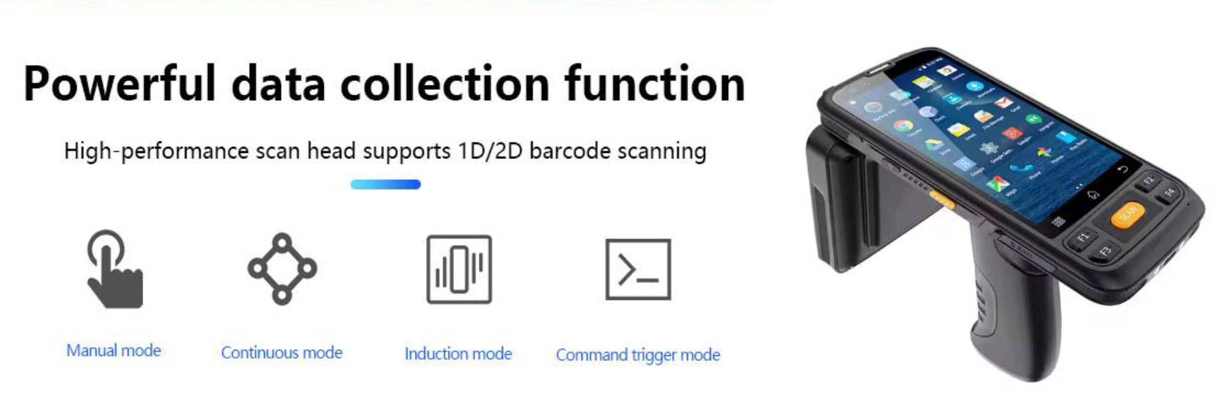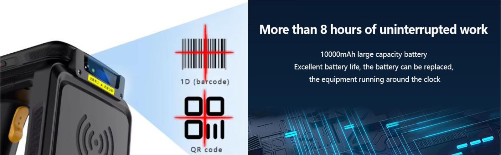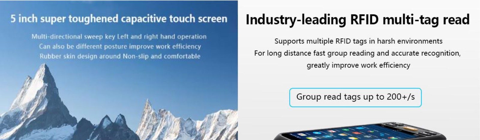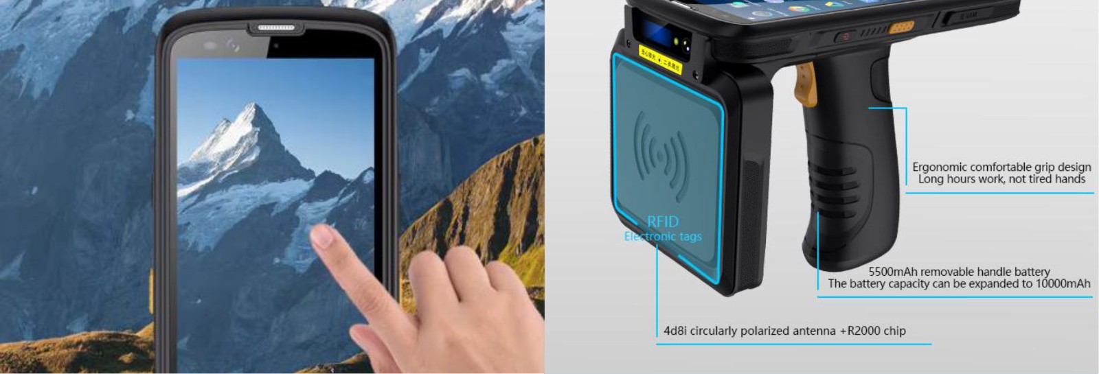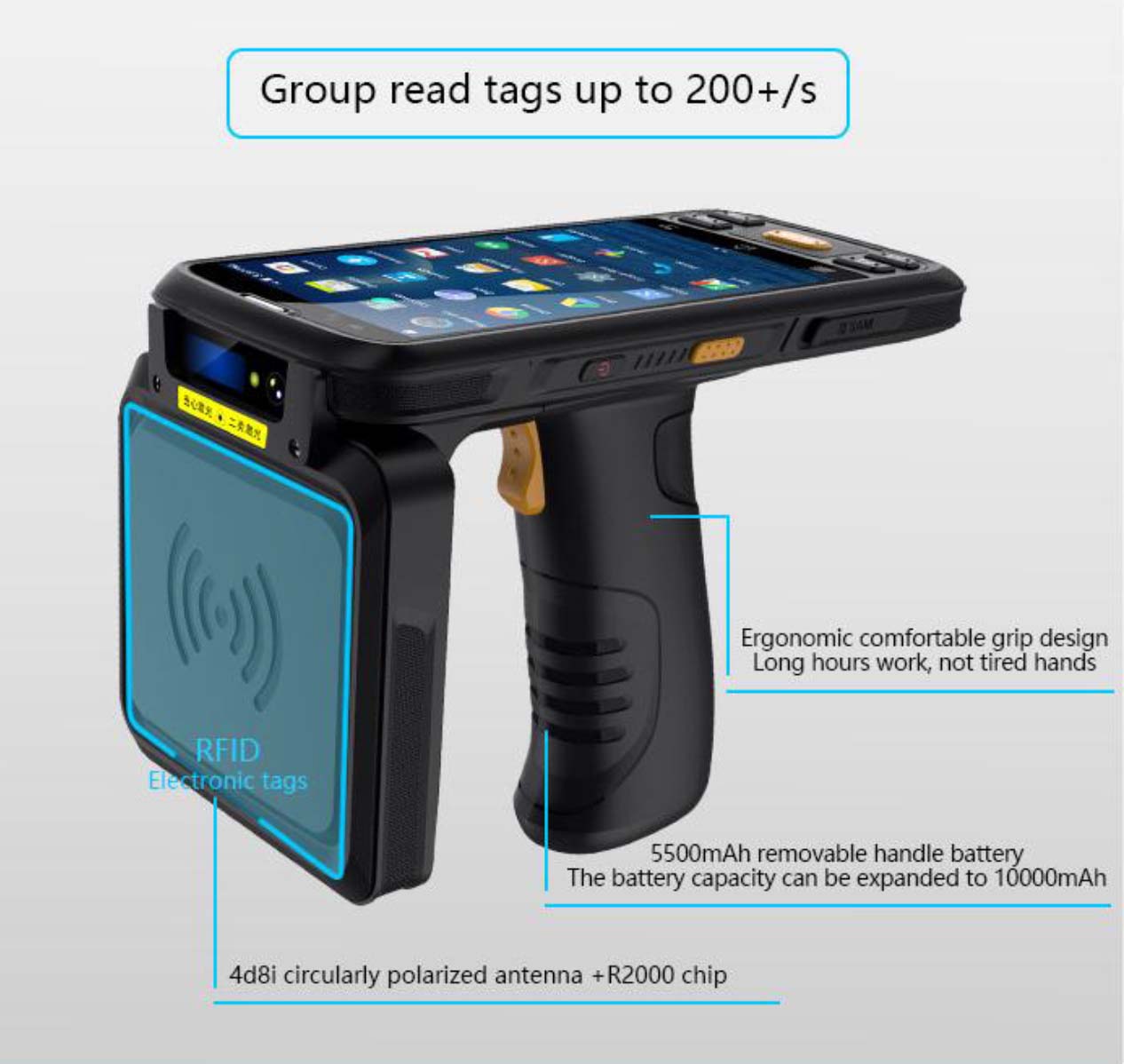 This product integrates powerful UHF RFID functions. It adopts the self-developed ultra-high frequency module based on Impinj E710/R2000 chip, which can collect data accurately and quickly, and has a wide reading range. The reading distance in an open outdoor environment exceeds 15 meters. It also supports barcode functions, adopts an eight-core processor, has diverse functions and complete configurations. In addition, it has a large-capacity battery of up to 10,000 mAh, 5 inch display, and an optional that supports public security database fingerprints. Group reading of tags 200pcs/second.